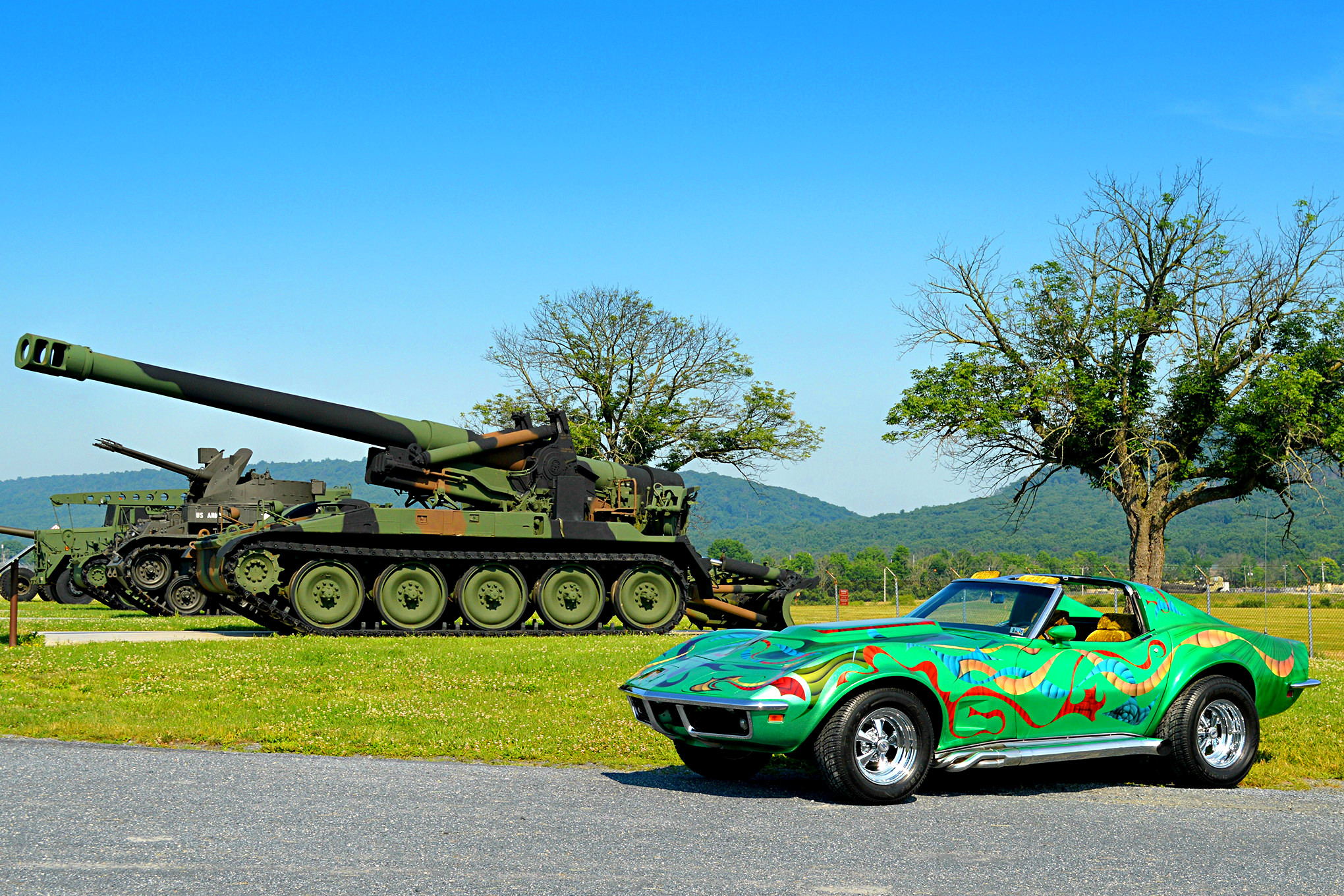 This Fort Indiantown Gap Military Base, US Army M110 203mm Self-Propelled Howitzer provides an impressive backdrop for Kevin Livering’s Green Monster custom 1969 Corvette. Army Green/Custom Car Green.
