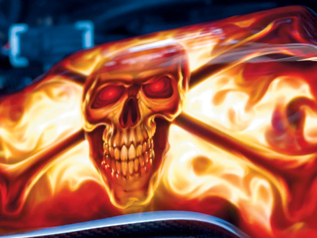 A peek under the hood reveals what all the fuss is about. While many are content with a few pieces of carbon fiber or chrome, Babler is not. He shipped his complete carbon underhood kit to Jaime Rodriguez, at Pure Image Design, for further customization. Rodriguez masterfully interpreted Babler's Deadly Sins theme into graveyards, sickle-bearing reapers, and even a skull or two with alarmingly overgrown incisors. There is enough fire and brimstone underhood to make Beelzebub himself proud.